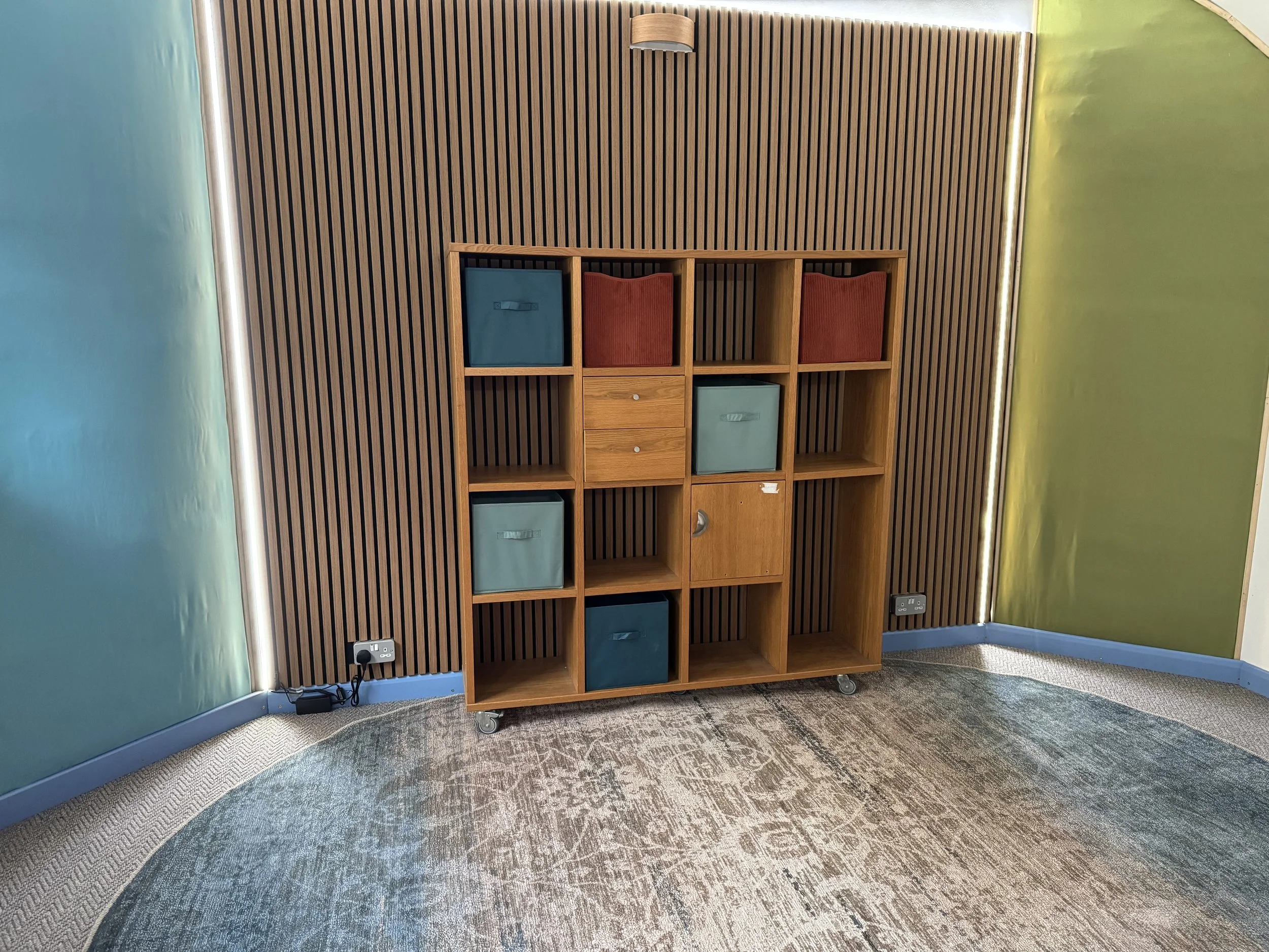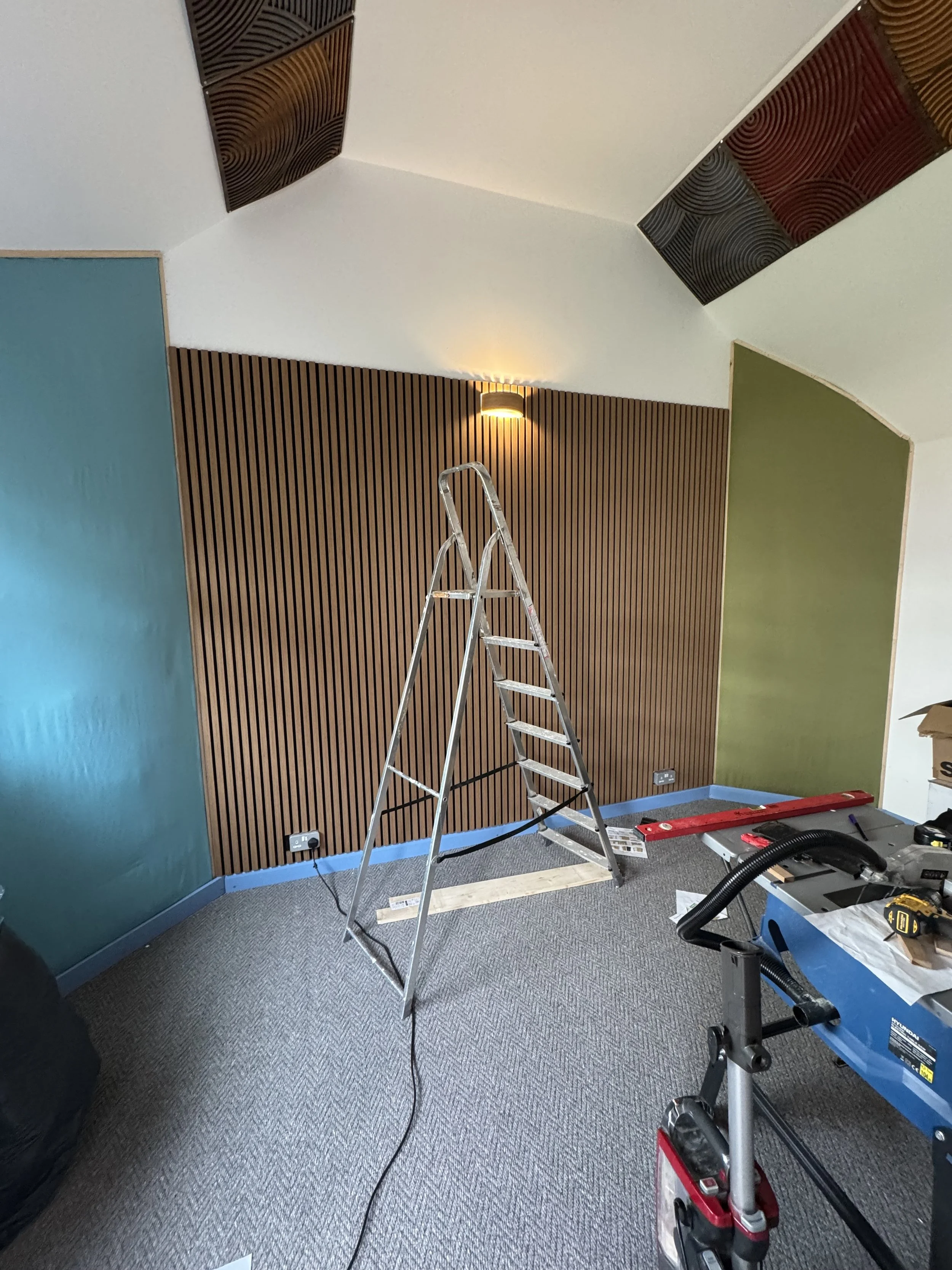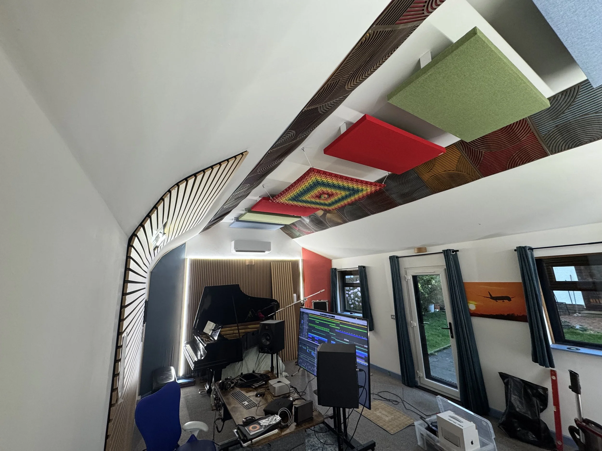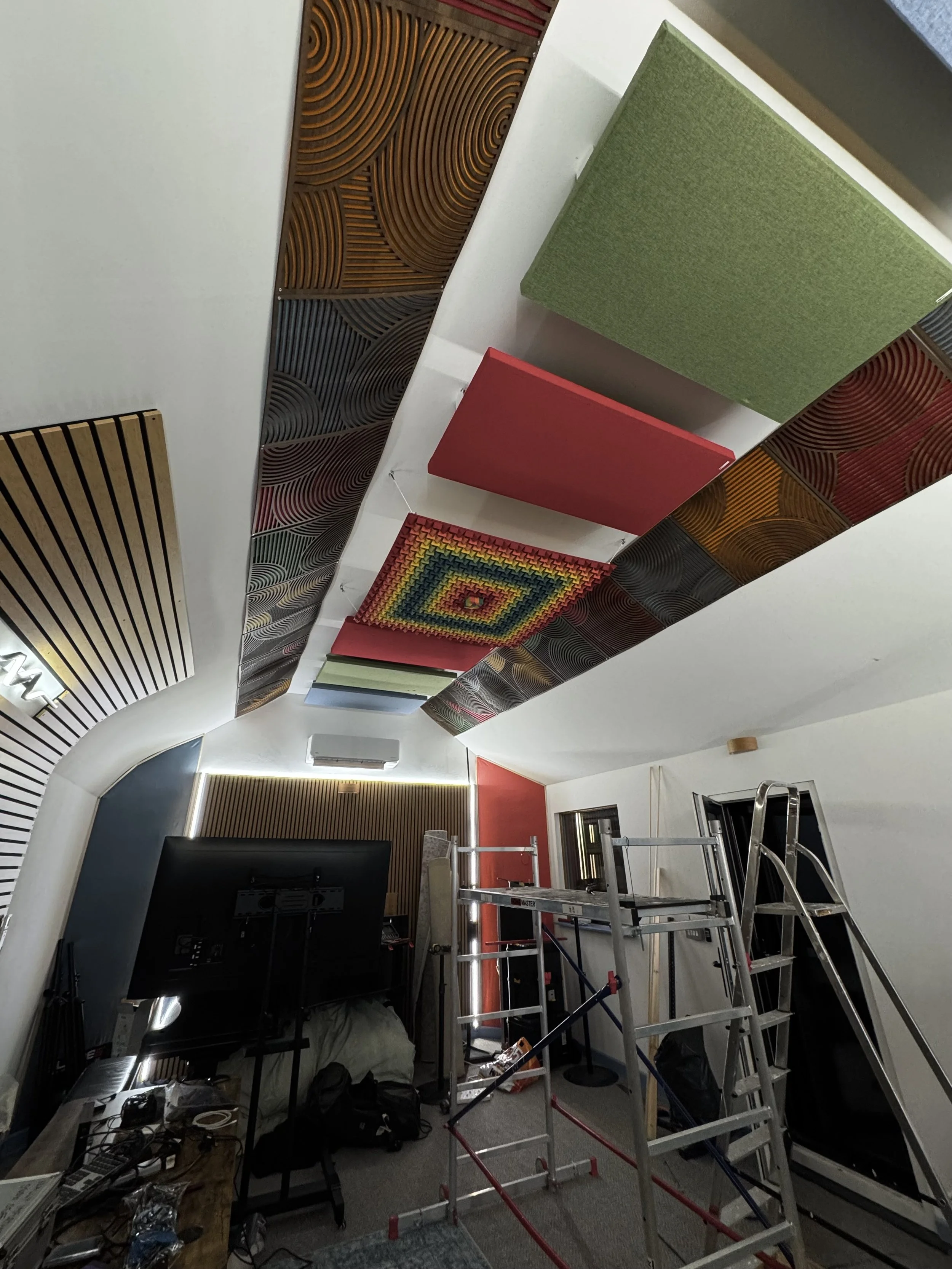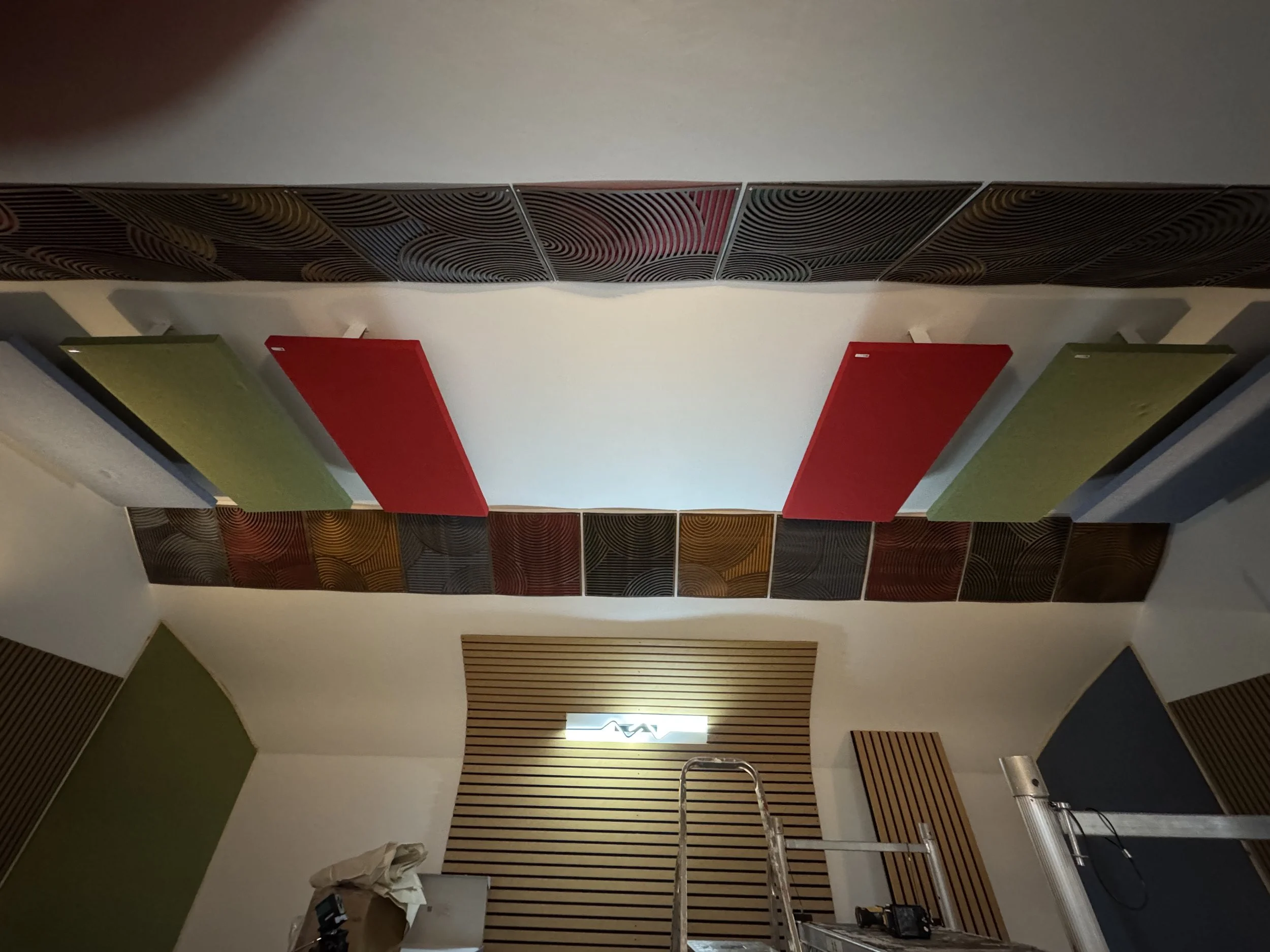 Ceiling reflections were treated by these panels, continuing the colour themes of the bass traps