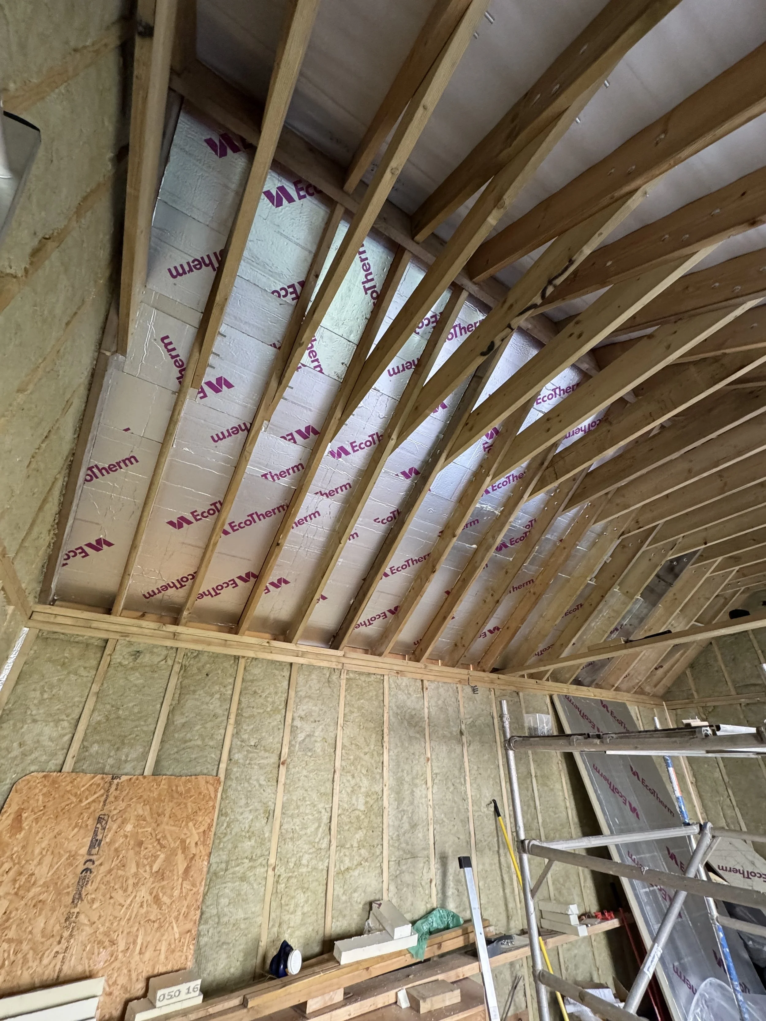 The top layer of the roof void was filled with 50mm foil backed polystyrene panels. These are the best solution for insulation from heat and cold, but are not the best for sound proofing so…