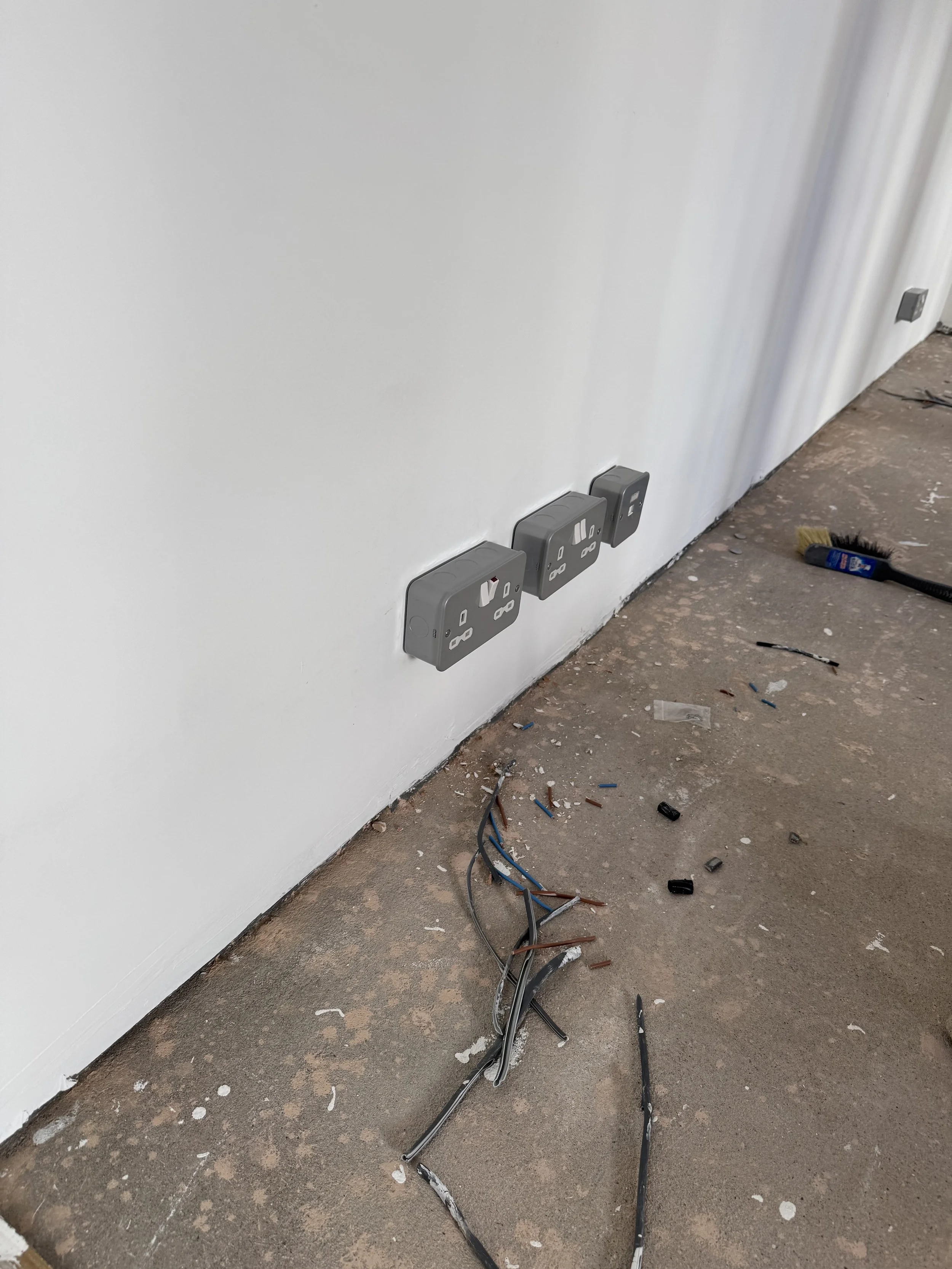 Phil my electrician came back to finish the electrics. As you can see I went for quite a crude way of fitting the plug sockets. I chose to wall mount them purely to keep the means of sound escaping, to a minimum. As soon as you cut into walls to mount plug sockets flush, you undo much of the hard work of the soundproofing.