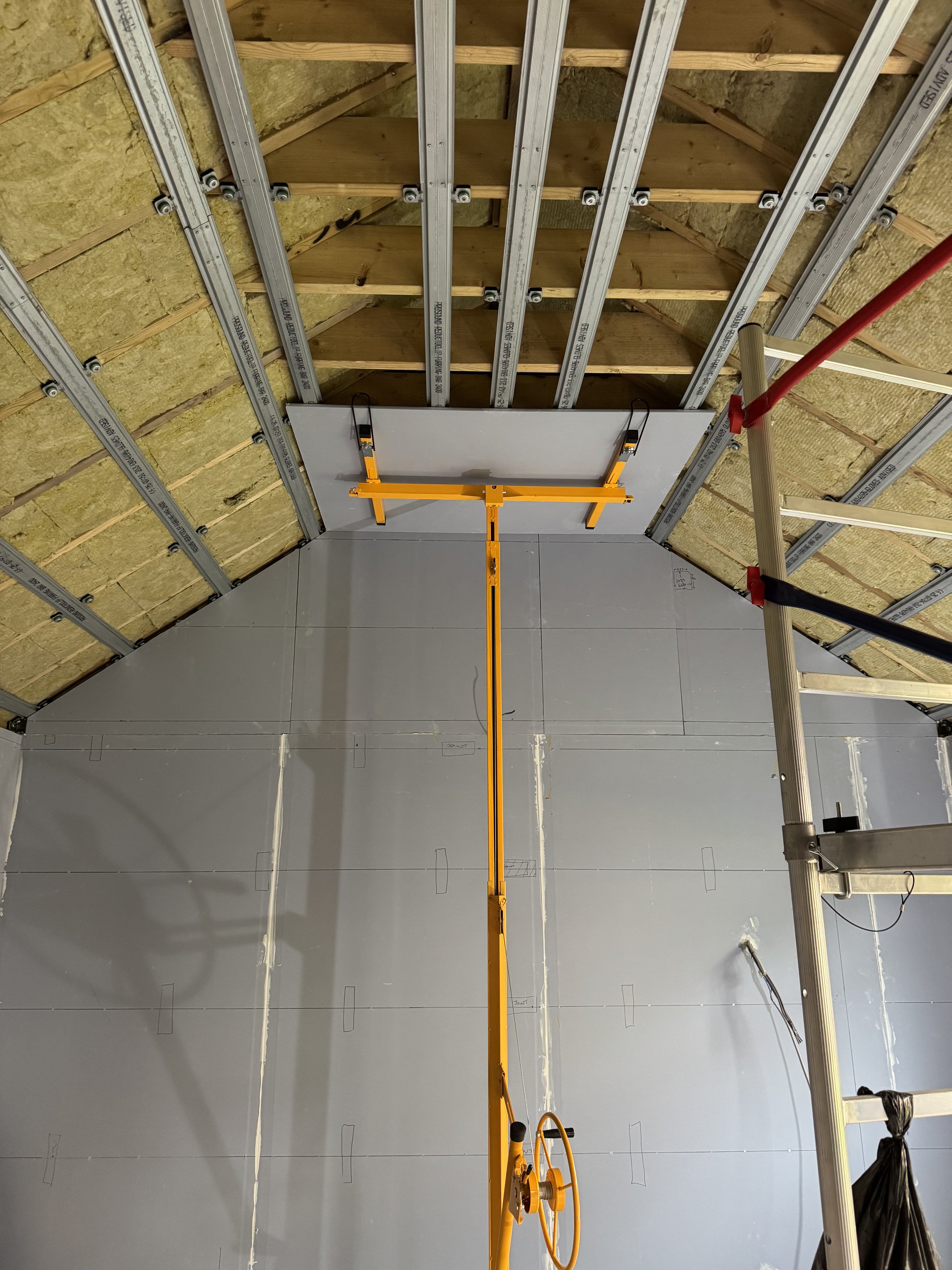 The trickiest part was always going to be the ceiling. To build it I had to purchase a plasterboard hoist. The ones you can rent stretch to just over 3m. My ceiling was higher than that. So I had to buy one that went up to 5m.