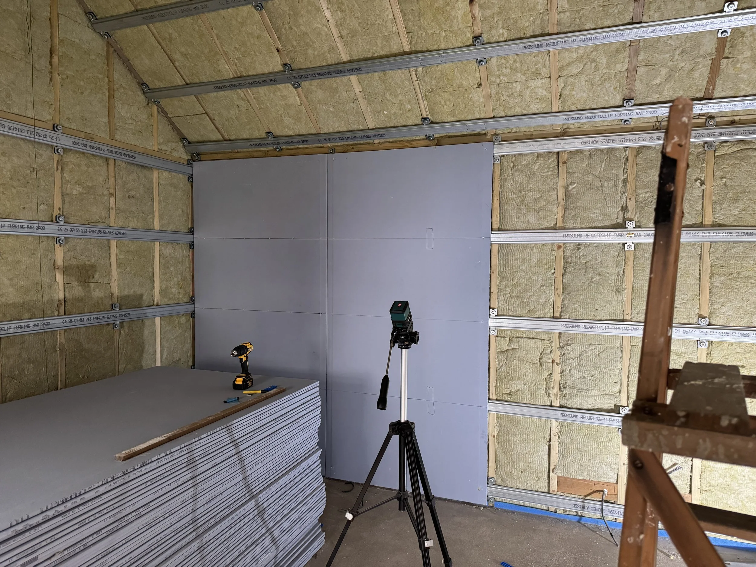 To contain the sound within the building, I had two options, build a first wall and then another stud frame within that wall, or…… attach drywall to the timber but isolate vibrations from the studs with specialist construction methods. I chose the second option because primarily I wanted to have a larger soundspace and a second floating internal wall/ceiling would have stolen too much floorspace.