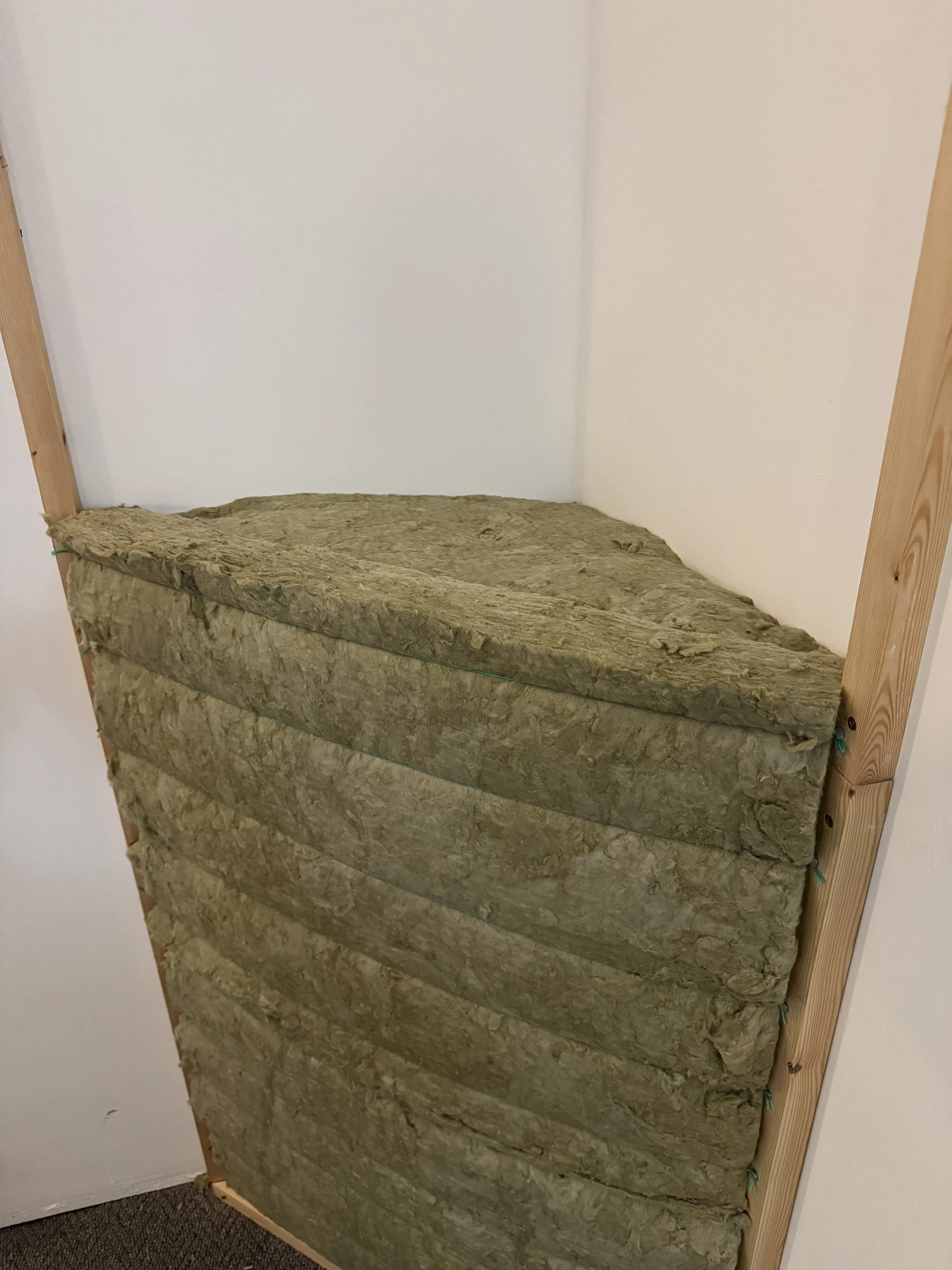 This, if you’re not a dedicated audiophile, is a half finished bass trap. Basically the corners of buildings tend to be the focal point for sub bass that emanates from the corners. As you can see it looks very much like a pork loin. But instead of pig meat I have used rock wool off cuts from earlier in the project. These ended up being about 50cm deep to the corner and because of the way I used string to secure the rock wool, I packed them very tight. According to my PhD Physicist son, Alfie, this should do a decent job of taming the low frequencies that were going to bounce around the studio.